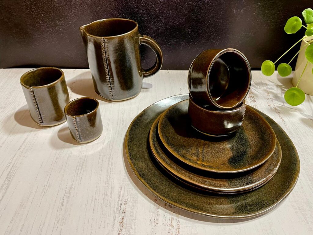 J’aime repenser le mélange des matières avec un émail corten ou moiré, fait maison à base d’oxyde de fer.